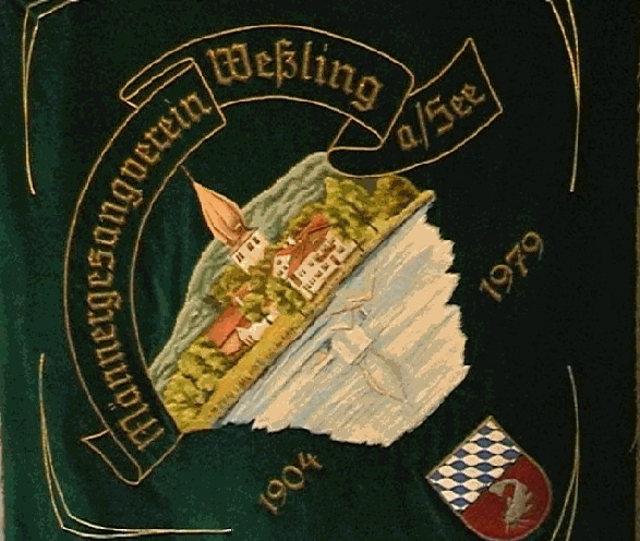 Anlässlich seines 100-jährigen Bestehens erhält der MGV Weßling vom Bundespräsidenten die Zelterplakette verliehen. Bei einem Festakt in Kloster Seeon überreicht Kultusminister Goppel die Urkunde und die Plakette an den Vorstand und Chorleiter. Damit die Plakette (15 cm im Durchmesser) nicht in einem Schrank verstaubt, hat der MGV ein Fahnenband in Auftrag gegeben auf dem diesem Ereignis gedacht werden soll. | ||